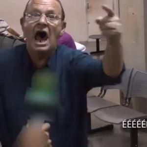 Enquanto uma senhora dava entrevista para a TV, reclamando da situação do atendimento, este velhinho indignado interrompe a entrevista, pedindo um café!